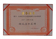 授(shou)予:東風汽車(che)公(gōng)司東風牌汽車(che)及(ji)零部(bu)件2007-2008年(nian)度 湖(hú)北出口名(míng)牌